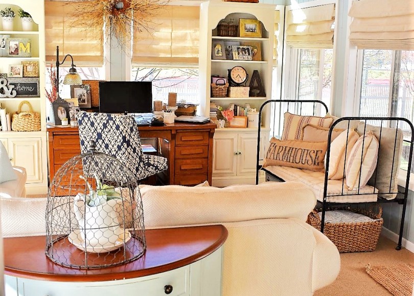 The point to my suggestion to keep your larger pieces neutral in color is because that way you can bring in your color scheme through pillows, artwork and decor. These are smaller items that can easily be changed. Case in point, I started in my home office with a color scheme that included muted reds and blues. I incorporated these colors into the space through throw pillows. My vintage crib illustrates this well: