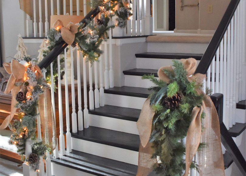 But in the middle of my loving decorating for Christmas, keep in mind I still work full time. I’m in sales in the tech field, which means I’m either buried in email and conference calls in my home office or earning Platinum status on Delta Airlines. So adding, “Make Christmas” to an already long and full to do list is slightly daunting to say the least. Case in point, that garland on my stairs went up over my lunch break on December 21st. And after tugging and pulling, draping and burlap bow tying all while covered in faux flock from hair to sock, I’ll probably leave that baby up until February 1st. (It was too much work to take it down already!)