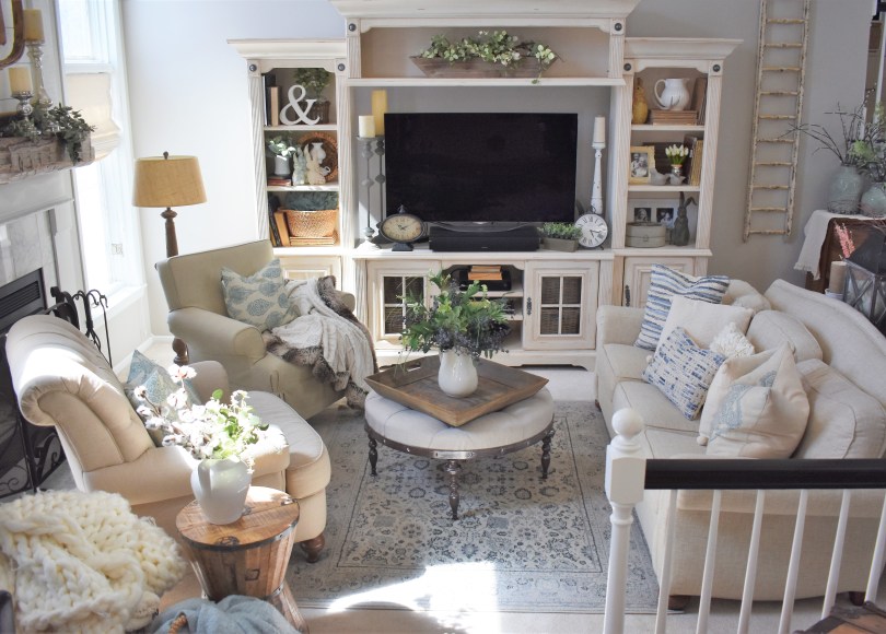 Even though the calendar says spring, outside our windows it is still winter. But inserting a lot of faux florals helps insert some life into the space. My favorite stores for florals are Eco Chic Boutique, Burlap, Scheel’s, Pier One and Hobby Lobby.As much as I LOVE my authentic vintage tobacco basket, the burlap wreath inside it gets lost. I am on the hunt for a floral wreath . . . stay tuned.I get a lot of questions about this light fixture – Wayfair!Do you spy this adorable denim poof next to the leather chair? Home Goods – all day long. $59.This rug has a sentimental history close to my heart, but for now I’ll simply share that it is from Tuesday Morning – one of my favorite stores. The center pillow is Magnolia, the one on the left is Home Goods and the one on the right is another Tuesday Morning find. My sofa is 15 years old – it is Ethan Allen and I had it recovered about 4 years ago. (It used to be red and taupe floral!)Our main living area – wider angle. Desks make a great sofa table in large great rooms like ours. Mine is from Pier One Imports, I believe they still carry it. I purchased this one approximately four years ago. You’ll also note a little hack for adding interest if you have a piano. Ditch the bench it came with and use a padded longer version. This one is form Scheel’s, I bought it in 2012.