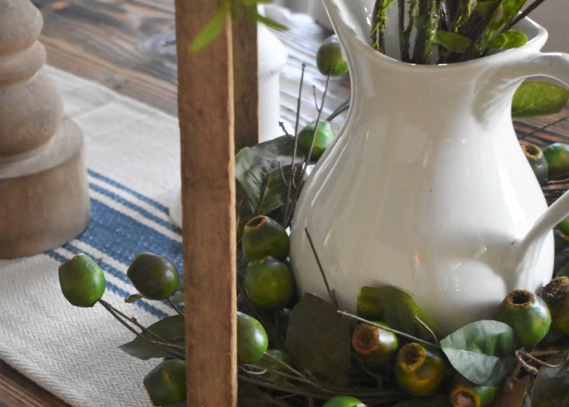 The centerpiece on this table is something I love so much I use it as my profile picture on Instagram and it shows up pretty often as my cover photo on Facebook, too.  It’s kind of my unofficial brand, that is how much I love these faux berries tucked into a vintage porcelain pitcher.  The only time I remove these berries is during Christmas time – otherwise I think they’re so versatile that they work from spring to fall and everything in between. I bought these berries about three or so years ago from Eco Chic Boutique, (Maria – bring them back! So cute!)
