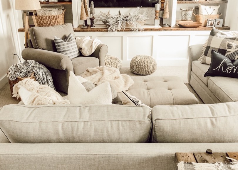 My Pottery Barn sectional arrived a few weeks later and . . . it was the wrong fabric! It was supposed to be the same nubby texture as the ottoman and it was not.  I had about five seconds of dissappointment but then I just decided – oh well. (I did research it and yes – I ordered the wrong fabric. So it was my own fault.)  But the size, scale and comfort were there and it still fit into my color scheme so I didn’t sweat it.